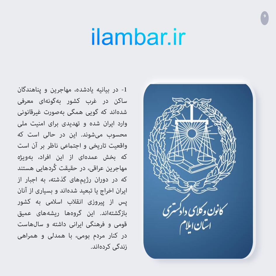 ۱- در بیانیه یادشده، مهاجرین و پناهندگان ساکن در غرب کشور به‌گونه‌ای معرفی شده‌اند که گویی همگی به‌صورت غیرقانونی وارد ایران شده و تهدیدی برای امنیت ملی محسوب می‌شوند. این در حالی است که واقعیت تاریخی و اجتماعی ناظر بر آن است که بخش عمده‌ای از این افراد، به‌ویژه مهاجرین عراقی، در حقیقت کُردهایی هستند که در دوران رژیم‌های گذشته، به اجبار از ایران اخراج یا تبعید شده‌اند و بسیاری از آنان پس از پیروزی انقلاب اسلامی به کشور بازگشته‌اند. این گروه‌ها ریشه‌های عمیق قومی و فرهنگی ایرانی داشته و سال‌هاست در کنار مردم بومی، با همدلی و همراهی زندگی کرده‌اند.