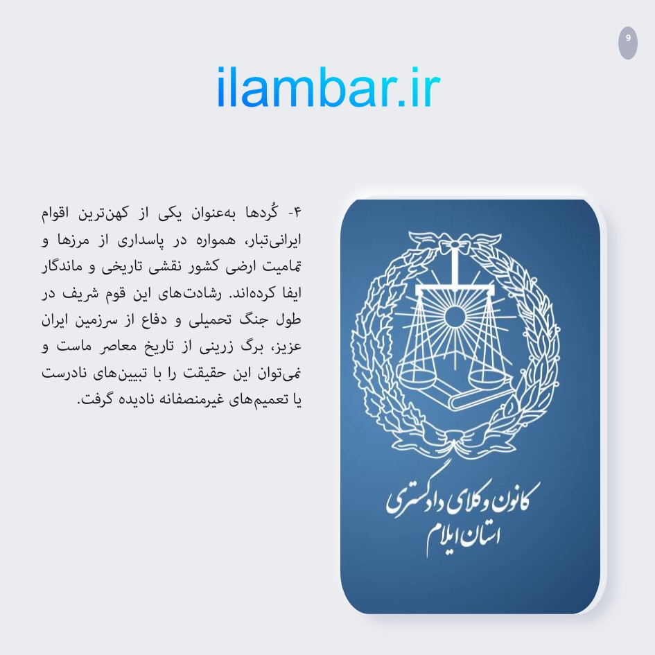 ۴- کُردها به‌عنوان یکی از کهن‌ترین اقوام ایرانی‌تبار، همواره در پاسداری از مرزها و تمامیت ارضی کشور نقشی تاریخی و ماندگار ایفا کرده‌اند. رشادت‌های این قوم شریف در طول جنگ تحمیلی و دفاع از سرزمین ایران عزیز، برگ زرینی از تاریخ معاصر ماست و نمی‌توان این حقیقت را با تبیین‌های نادرست یا تعمیم‌های غیرمنصفانه نادیده گرفت.
