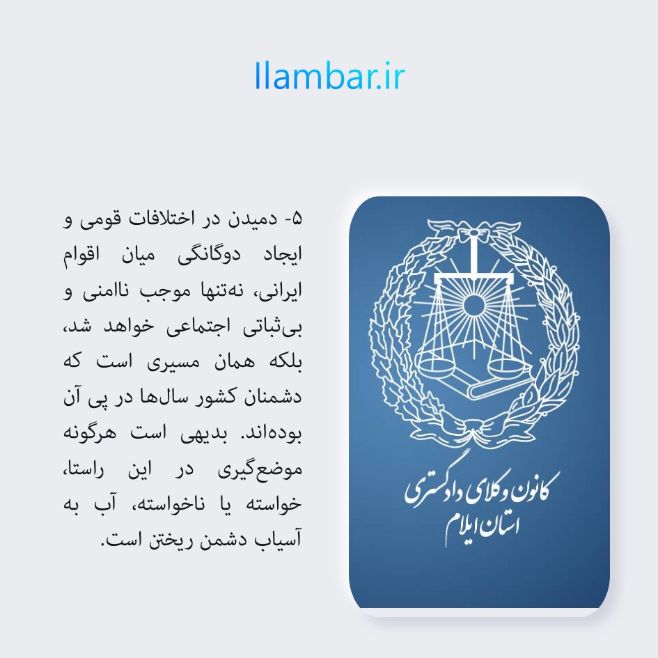 ۵- دمیدن در اختلافات قومی و ایجاد دوگانگی میان اقوام ایرانی، نه‌تنها موجب ناامنی و بی‌ثباتی اجتماعی خواهد شد، بلکه همان مسیری است که دشمنان کشور سال‌ها در پی آن بوده‌اند. بدیهی است هرگونه موضع‌گیری در این راستا، خواسته یا ناخواسته، آب به آسیاب دشمن ریختن است.